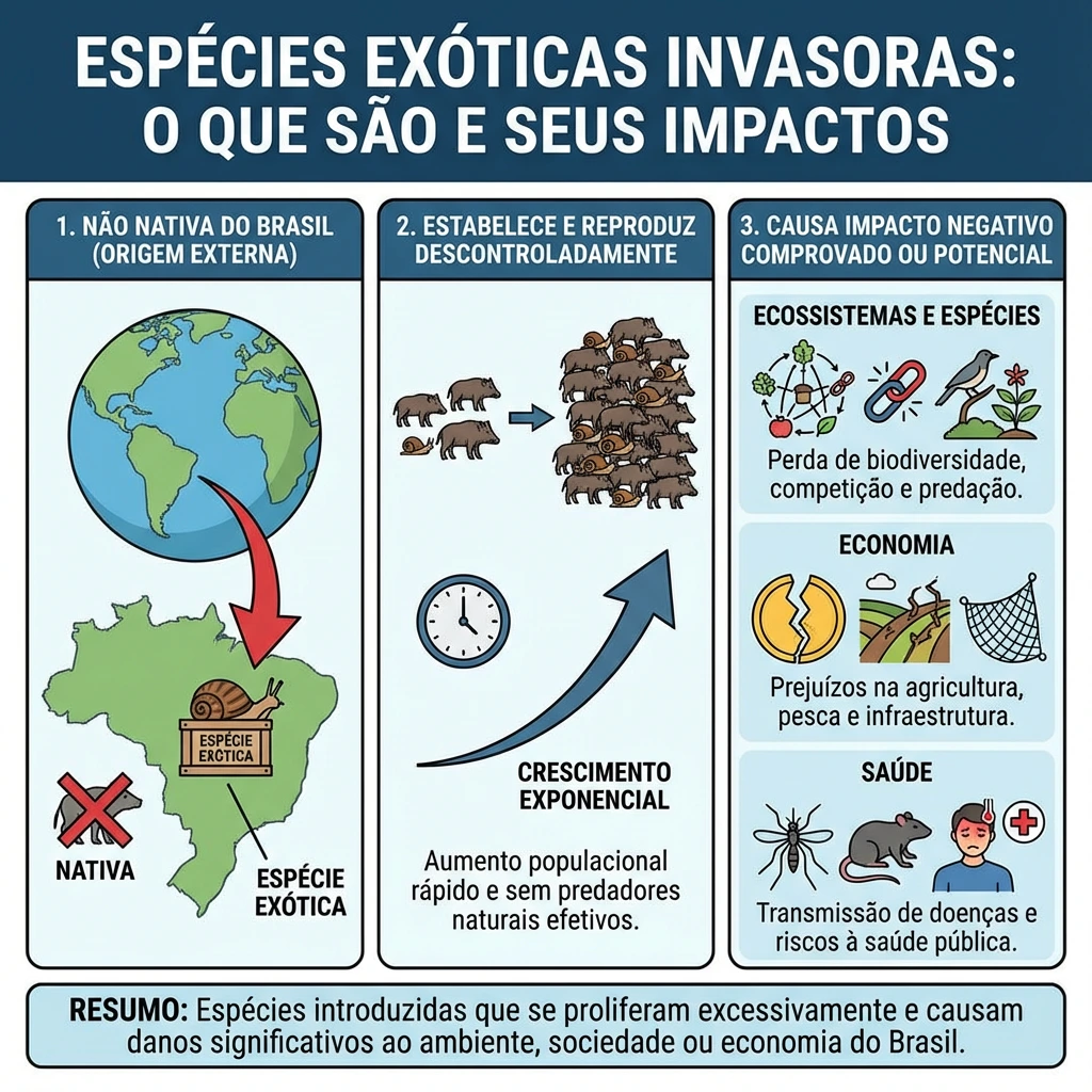 - Causar impacto negativo comprovado ou potencial sobre ecossistemas, espécies, economia ou saúde.